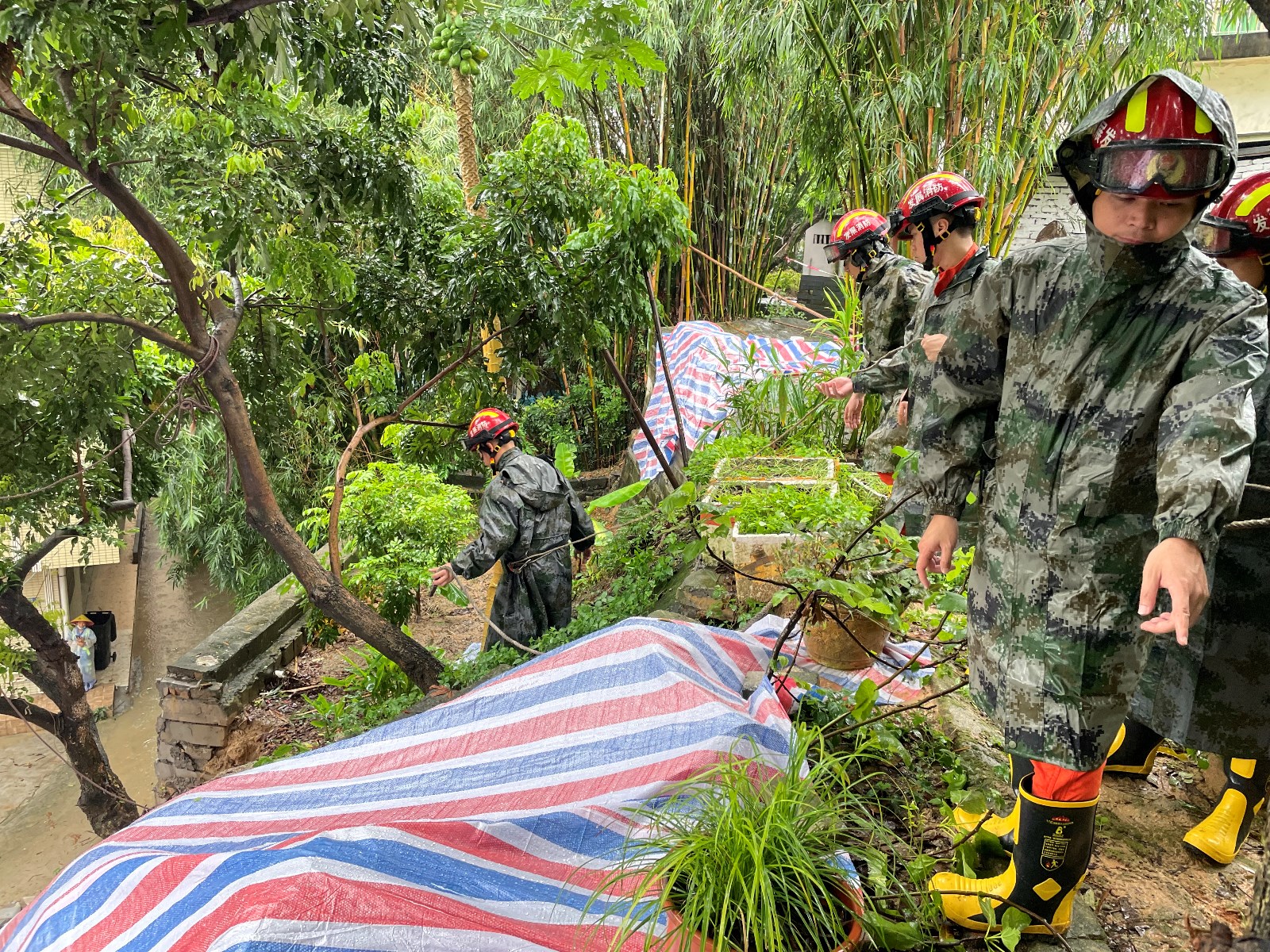 12:36,消防队14名指战员到达受灾区域,与坦头村委共同勘察山体滑坡情况,滑坡面积达200㎡左右。经研判,雨势持续加大,发生二次滑坡可能性大。对此,消防队先对毗邻民房群众进行疏散,再利用防水布对滑坡面覆盖,降低二次滑坡风险。14:20完成全部处置任务,滑坡面得到了有效控制,确保了周边群众的安全。